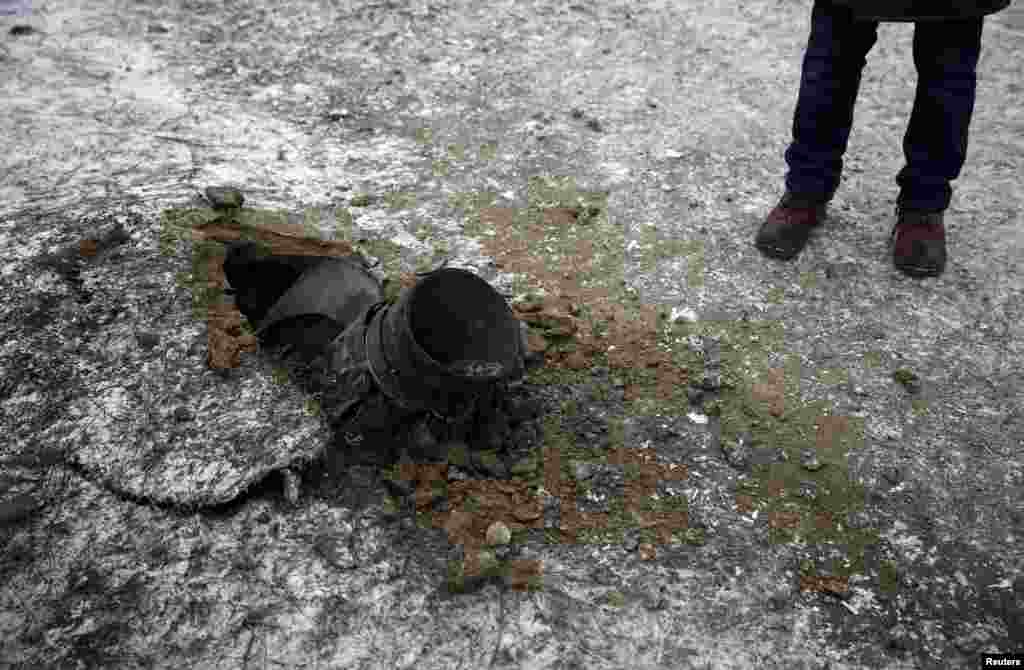 Люди осматривают реактивный снаряд, упавший на одной из улиц Краматорска