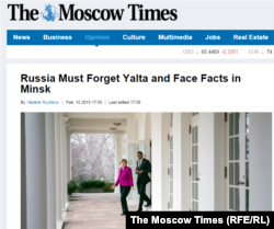 России следует забыть о Ялте и посмотреть в лицо фактам в Минске - так озаглавлена колонка политолога Владимира Рыжкова в The Moscow Times. "Возвращение к методам, используемым во времена Ялтинской конференции невозможно. Мир с тех пор необратимо изменился. В частности, в отличие от событий 70-летней давности, сегодня нельзя игнорировать желания людей".
