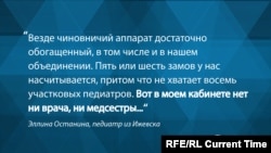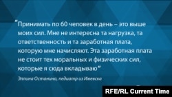 Педиатр из Ижевска Эллина Останина в сентябре отказалась вести второй участок: "Принимать по 60 человек в день – это выше моих сил. Я прихожу домой с разбитой головой. И мне неинтересна та нагрузка, и та ответственность, и та заработная плата, которую мне начисляют. Она не стоит тех моральных и физических сил, которые я сюда вкладываю".