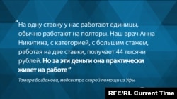Медсестра Орджоникидзевской районной подстанции скорой помощи Уфы Тамара Богданова рассказала в интервью корреспонденту Радио Свобода, что врач, работающий на ставку в зависимости от категории и стажа, получает от 20 до 25 тысяч рублей в месяц.
