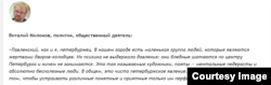 По мнению политика Виталия Милонова, "Павленский — это второе дыхание некоего Волан-де-Морта в угасающем теле Марата Гельмана. Если Гельман — это разрушающийся в прах фрик, то Павленский — его реинкарнация. Путин, как Гарри Поттер, победил всех оппозиционеров, и они уползли змеями в свои пещеры креативных пространств и выставочных залов".