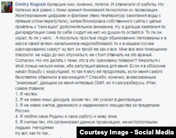 "Я честен. Я не имею иных доходов, кроме тех, что указал в декларации. Я не имею счетов, движимого и недвижимого имущества за пределами России. Я люблю свою Родину и свою работу и живу этим. Я считаю тех, кто организовал данную провокацию, нечистоплотными людьми. Негодяями", – написал Рогозин в комментариях к своему посту в фейсбуке.