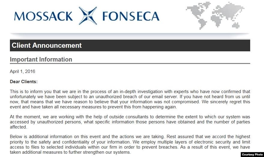 Письмо клиентам фирмы Mossack Fonseca & Co