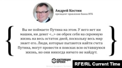 "Он [Владимир Путин] обрек себя на скромную жизнь на весь остаток дней, поскольку весь мир знает его. Люди, которые пытаются найти счета Путина, могут провести в поисках всю оставшуюся жизнь, но они никогда ничего не найдут", – отметил Костин.