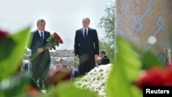 Путин в сопровождении премьер-министра Шавката Мирзияева посетил историческое кладбище Шахи-Зинда, где возложил цветы на могилу Каримова.