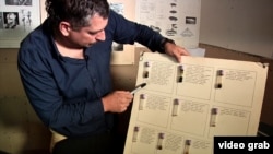 Шония показывает образцы жидкости в колбах: это, по его словам, та самая жидкость непонятного происхождения, которая была обнаружена на месте, где, якобы, приземлился "НЛО".