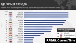 Уровень свободы в разных регионах оценивался по шкале от 0 до 100 единиц (где 100 – лучший результат). Россия получила по оценке Freedom House, лишь 20 пунктов. Ее ближайшими "соседями" по результатам оказались Китай и Конго с 19 пунктами.