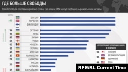 Во вторую группу, "частично свободных" стран, попали четыре страны бывшего СНГ: Грузия с 64 пунктами, Украина, которая получила 61 пункт, Армения с 45 и Кыргызстан с 37. Уровень свободы в Грузии и Украине, по оценке Freedom House примерно соответствует уровню свободы в Турции, Мексике или Колумбии. В Армении – уровню Пакистана, а в Кыргызстане – уровню Марокко или Малайзии.