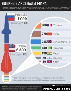 За последний год Россия обогнала США по числу готовых к применению ядерных боеголовок, говорится в исследовании стокгольмского Международного института по исследованию проблем мира (SIPRI).