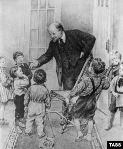 Первый бездетный руководитель советской России – Владимир Ильич Ленин – это, собственно, первый человек, который начал какие-то идеологические отношения с детьми, вернее, вокруг него они были выстроены. Это чистой воды мифология. Насколько известно, ни Владимир Ильич, ни его супруга Надежда Крупская особой любви к детям не питали, но тем не менее несколько случайных встреч в Горках на его даче послужили причиной и поводом для целой серии хрестоматийных рисунков: Ильич играет с детьми в прятки, Ильич на елке, Ильич с ними на реке и так далее.