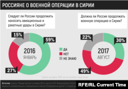 Практически каждый второй (49%) опрошенный "Левадой-центром" россиянин считает, что Россия должна завершить военную операцию в Сирии. В январе прошлого года год назад, согласно опросу того же центра, 59% россиян высказывались "за" продолжение операции.