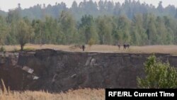 Воронка на месте провала в Львовской области больше напоминает кратер вулкана. Ее площадь – шесть га, почти 9 футбольных полей. Глубина – полсотни метров. Упавшие в провал опоры линии электропередач сверху выглядят как спички.