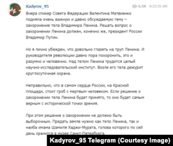 1 ноября глава Чечни выступил за захоронение тела Владимира Ленина, подчеркнув при этом, что решать этот вопрос должен президент России Владимир Путин. "Но я лично убежден, что довольно глазеть на труп Ленина. И руководителя революции давно пора похоронить, это и разумно и человечно. (…) Неправильно, что в самом сердце России, на Красной площади, стоит гроб с мертвым человеком. Если решение о захоронении тела Ленина будет принято, то оно будет самым верным с исторической точки зрения", – написал Кадыров в своем Телеграм-канале.