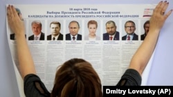 В бюллетенях для голосования записаны имена восьми кандидатов (в алфавитном порядке): Сергей Бабурин (партия "Российский общенародный союз"), Павел Грудинин (КПРФ), Владимир Жириновский (ЛДПР), Владимир Путин (самовыдвижение), Ксения Собчак ("Гражданская инициатива"), Максим Сурайкин ("Коммунисты России"), Борис Титов (Партия роста) и Григорий Явлинский ("Яблоко").