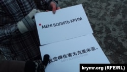 На одной из акций активисты раздавали листовки с надписью на разных языках: "Мне болит Крым".