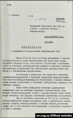 Начальник 6-го отдела УКГБ УССР в Киеве и Киевской области полковник Турко М.А. сообщил начальнику Припятского ГО УКГБ УССР в Киеве и Киевской области подполковнику Николаеву Ю.В. о получении информации о "недостаточной надежности реакторов РБМК-1000", которые применяются на ЧАЭС. "По мнению специалистов, в случае разрыва главного циркуляционного трубопровода в результате естественного старения металла, при отсутствии системы аварийного слива активной зоны и защитной оболочки вокруг реактора, произойдет утечка теплоносителя и, как следствие, значительное радиоактивное заражение местности. Причиной серьезной аварии может стать остановки подачи электроэнергии на системы управления работы реактора", – отмечает Турко.