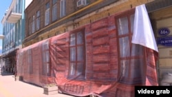Еще один объект культурного наследия – здание на Московской, 72 – баннерами закрывают прямо сейчас. Это доходный дом Кисина конца еще XIX века. Эклектичное здание с резными дверями и лепными украшениями тоже спрячут от туристов под фальш-фасадом – вместо того, чтобы те же деньги направить на его восстановление.
