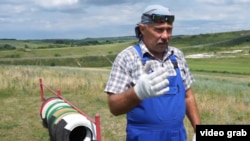 В поле Николай соорудил боулинг с использованием старых автомобильных покрышек.