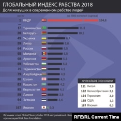 По данным Глобального индекса рабства за 2018 год, в Узбекистане 160 тысяч рабов, а на тысячу человек населения приходится 5,2 раба, лишь немногим меньше, чем в России.