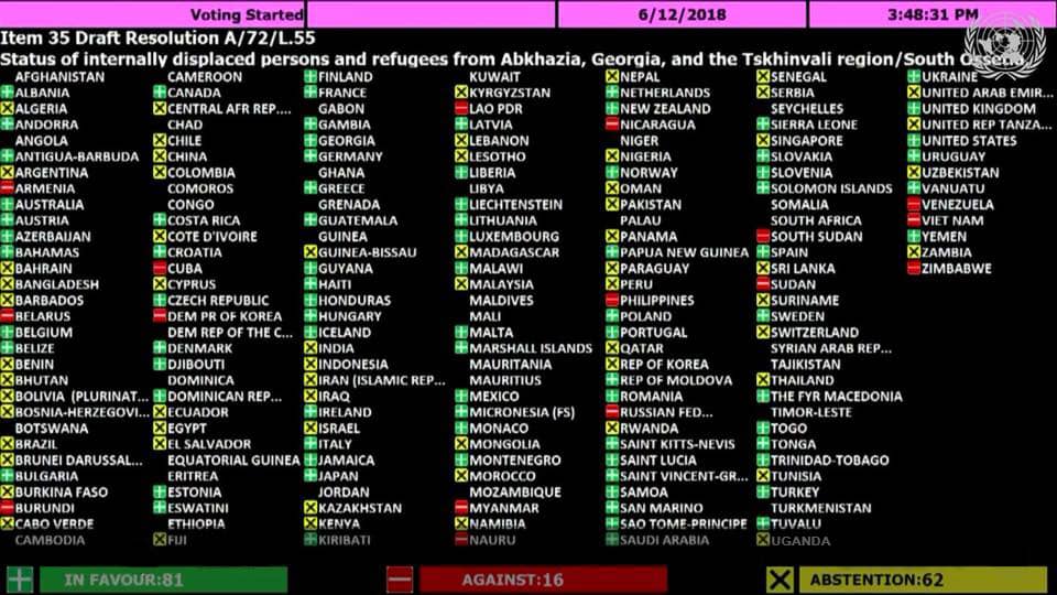 Ежегодно Грузия инициирует в Генеральной ассамблее ООН резолюцию «О статусе вынужденно перемещенных лиц», о праве возвращения беженцев в Абхазию и Южную Осетию. В 2018 году «за» проголосовало рекордное число государств – 81. Грузия обвиняет