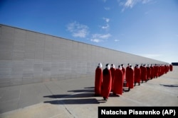 Сотни женщин несколькими днями ранее устроили тихое шествие в красных плащах и белых шляпах в столице Аргентины. Они переоделись в униформу героинь из книги-антиутопии Маргарет Этвуд "Рассказы служанки". Книга и снятый по ней популярный сериал рассказывают об обществе, в котором немногие женщины, у которых сохранилась репродуктивная функция, используются в качестве рабынь для богатых семей – они вынуждены рожать им детей.