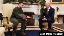 Президент США Джо Байден вечером 21 декабря проводит встречу с президентом Украины Владимиром Зеленским в Белом доме. Зеленский прилетел в Вашингтон на самолете американских ВВС из Польши из-за того, что небо надо Украиной сейчас закрыто из-за российского вторжения. Байден лично встретил Зеленского перед Белым домом и обнял его: