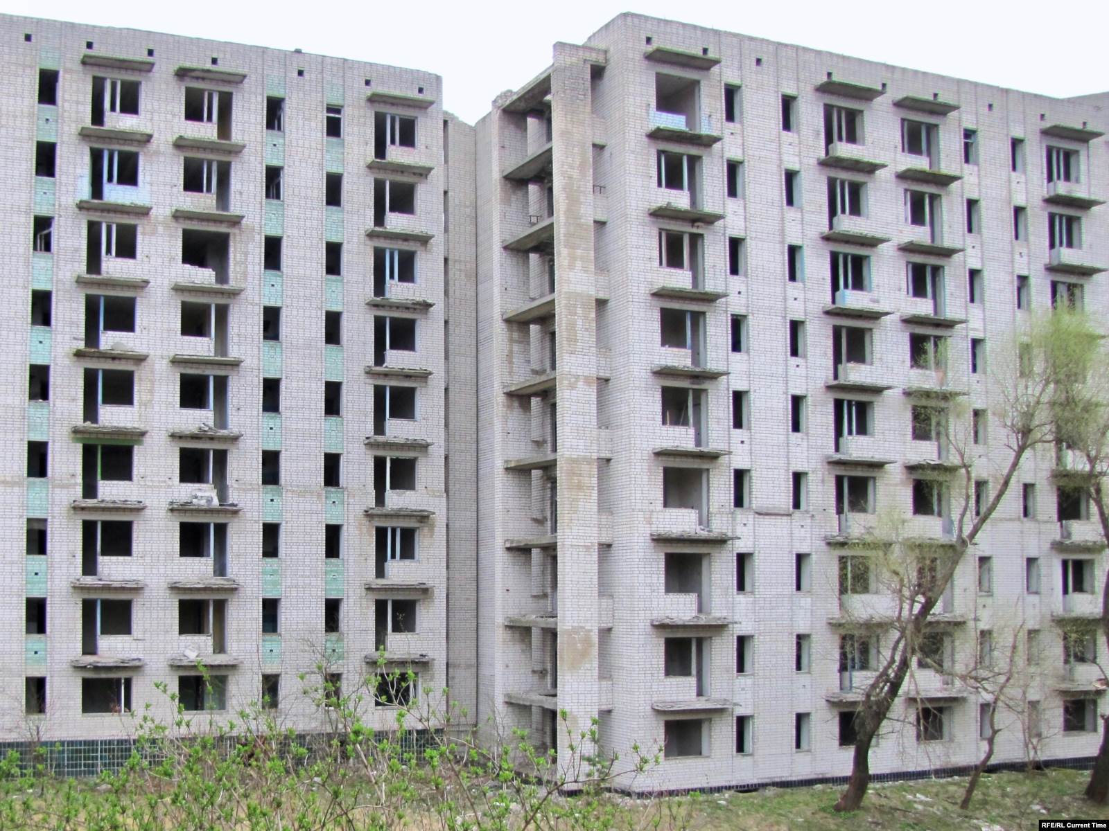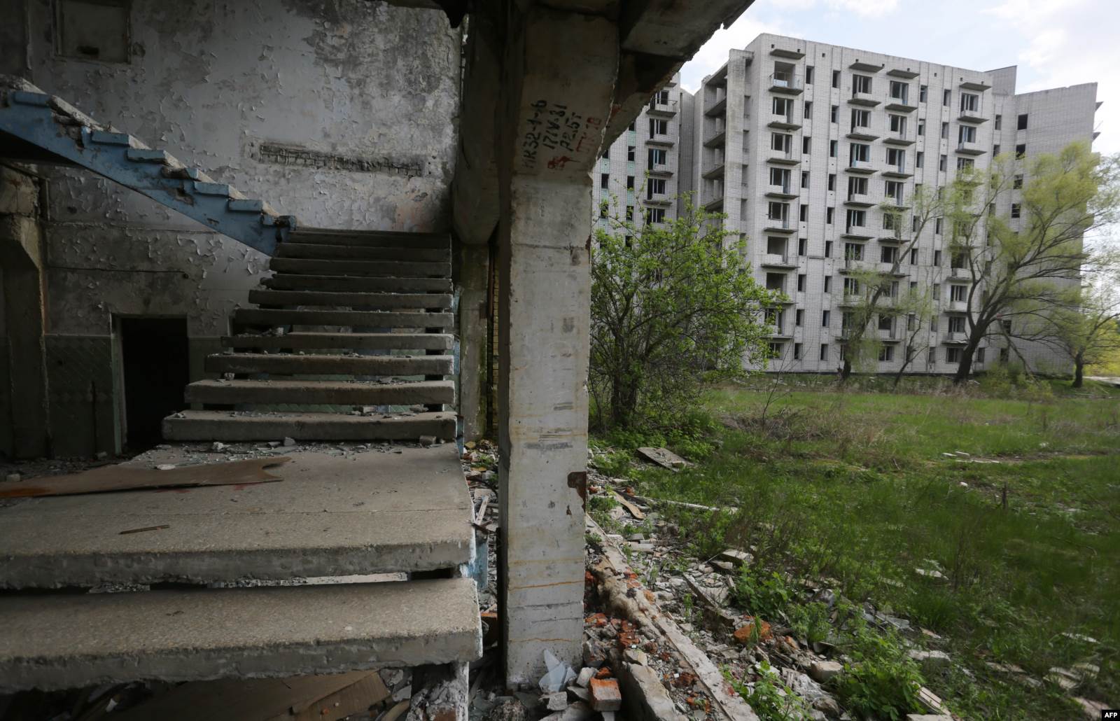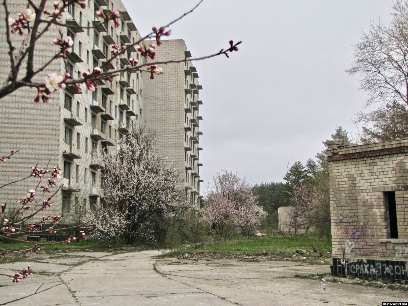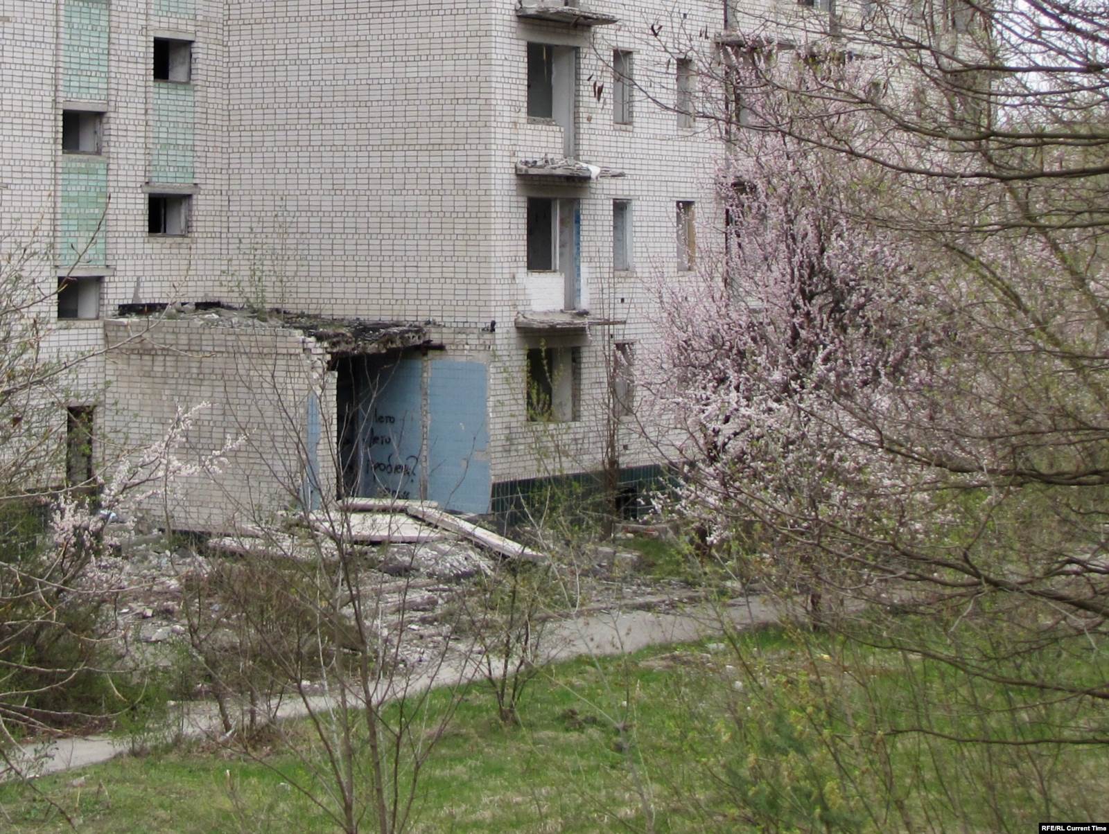 Впрочем, во всем этом видятся следы недавнего пребывания людей: на стенах свежие надписи на актуальные политические темы, на земле – разбитые бутылки и пластиковый мусор, внутри покинутых девятиэтажек – следы от краски для пейнтбола.