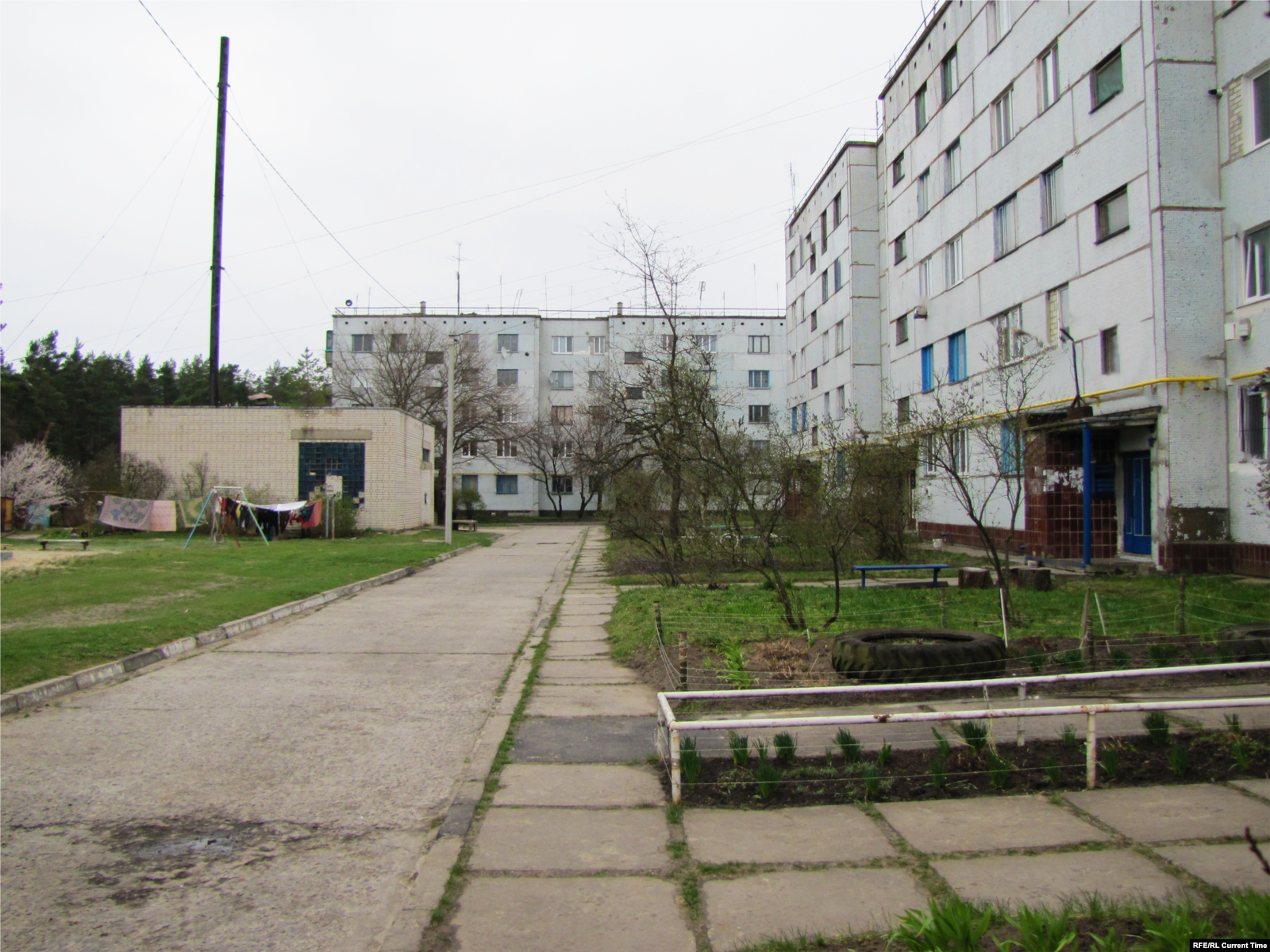 Типовые хрущевки выглядят обжитыми, хотя и несколько "потрепанными", во дворе сушится белье, возле подъезда одной из них стоит старая "Таврия", вокруг разбиты палисадники и огородики.
