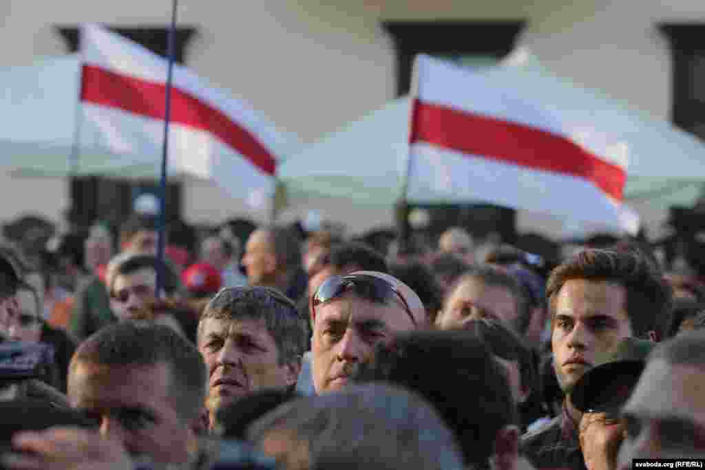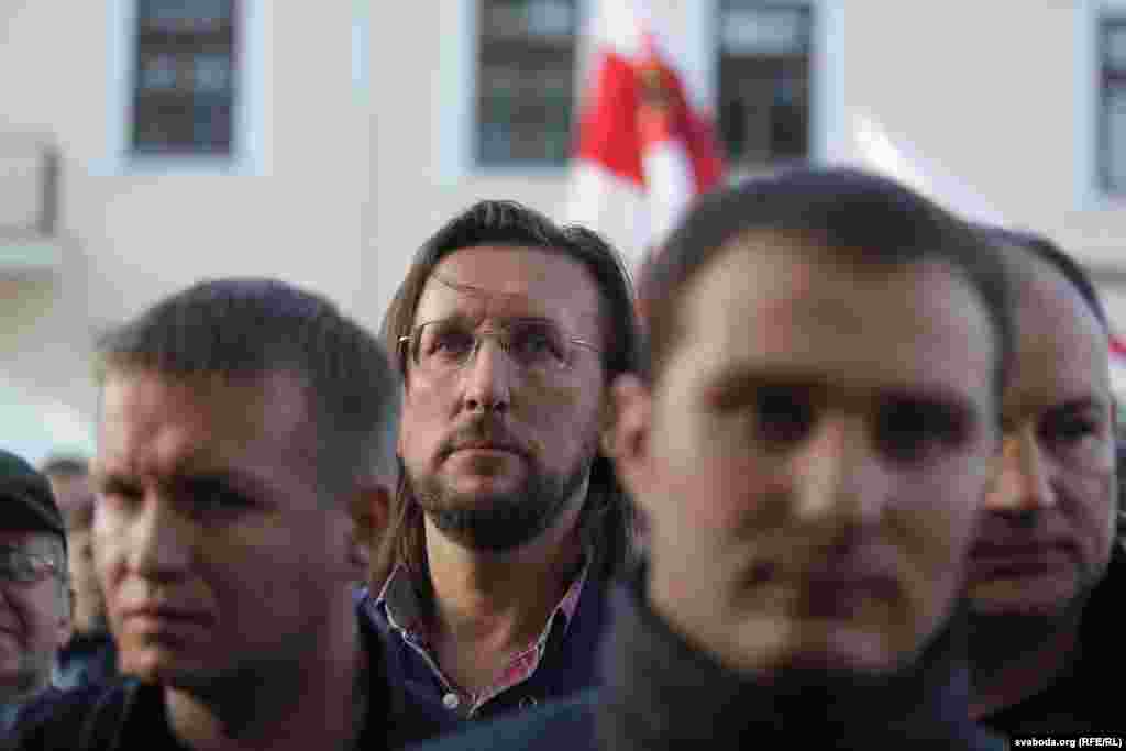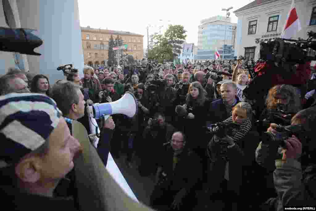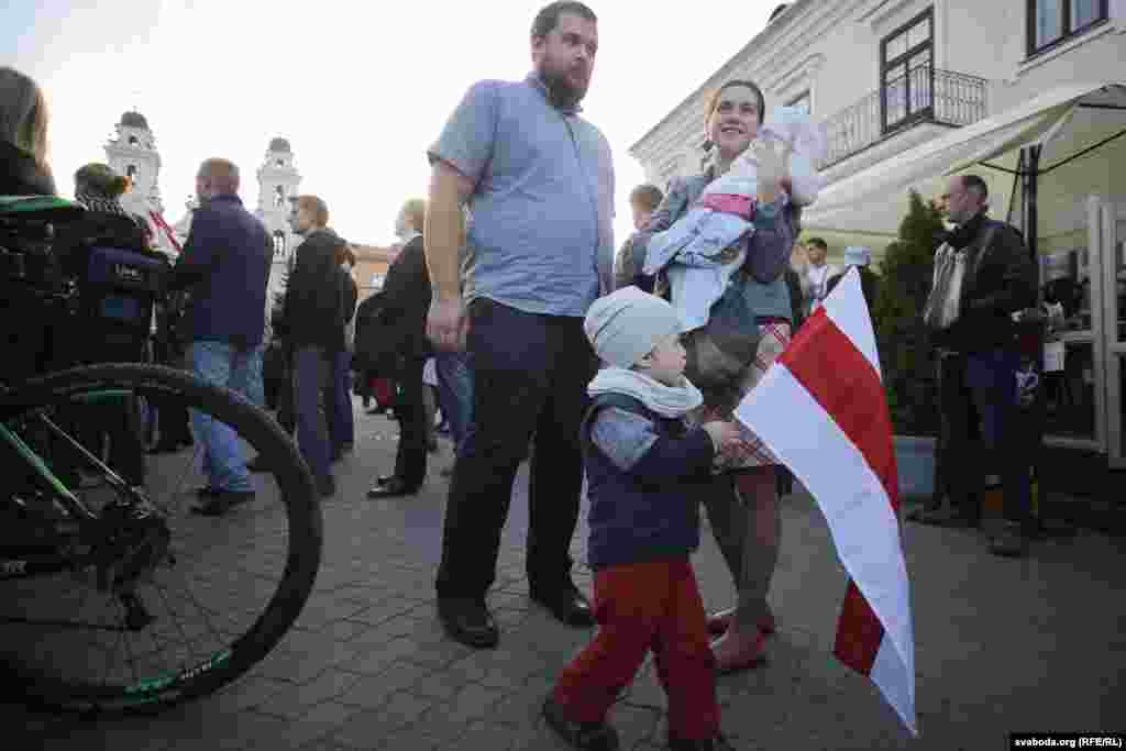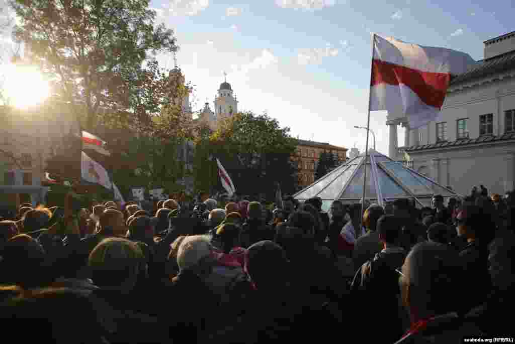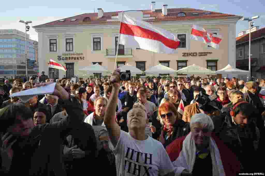 Несколько сот человек с плакатами, бело-красно-белыми флагами оппозиции и знаменами Евросоюза вышли 4 октября на улицы Минска, скандируя "Нам нужно мирное небо!" Акция не была разрешена властями