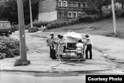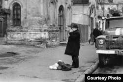 Он очень много ездил по Украине. И вот этого у него много. Он выбирал типичные ситуации образа жизни советского человека. Он в квартиры не заходил, не мог, а кроме того, он был фотографом архитектуры. Поэтому абсолютное большинство его фотографий сделаны на улице, на фоне домов, на фоне оформления улиц. Человек у него – часть города. Он выбирал не эстетические моменты, а выбирал социальные моменты: очередь; появилась американская машина – он фиксирует толпу возле этой машины; продали селедку и выливают маринад на улицу; грязная подворотня и идет несчастная женщина. Может, она и не несчастная, но в окружающем ужасе она выглядит беспросветно. С другой стороны, и жизнь беспросветна в этой подворотне с надписью "Слава КПСС".