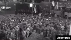 Видео с камер наблюдения, сделанное вечером 9 августа у стелы "Минск – город-герой", прислал читатель в редакцию белорусской службы Радио Свобода. На нем среди прочего видно, как начинались стычки протестующих с ОМОНом и как впервые силовики кидают в людей светошумовые гранаты.