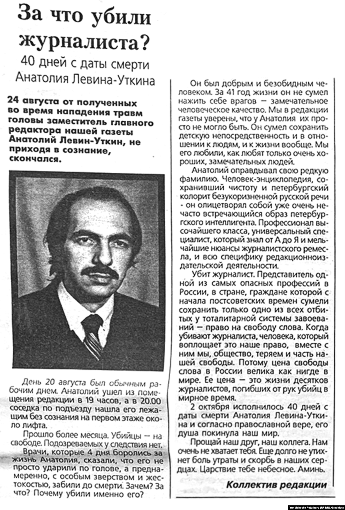 Настоящее Время и Радио Свобода публикуют полный текст статьи "Подполковник Путин незаконно возглавляет ФСБ", которую редакция газеты "Юридический Петербург сегодня" опубликовала 12 августа 1998 года под коллективным псевдонимом "А. Кириленко". Это произошло за неделю до того, как редактор издания Анатолий Левин-Уткин был найден избитым и без сознания у лифта в собственной парадной, а вскоре скончался в больнице.