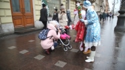 Машина паркуется на Невском, Дед Мороз со Снегурочкой начинают раздавать прохожим с детьми сладкие подарки. Реакция разная: кто-то отказывается, не веря в бескорыстие незнакомых артистов, кто-то (без детей) подходит за подарком несколько раз, кто-то, заметив фотографа, "понимающе" кивает: "Это вы на магниты нас фотографируете? Сколько стоит?" Но очень многие просто улыбаются и смеются, радуясь вдруг появившемуся новогоднему настроению.