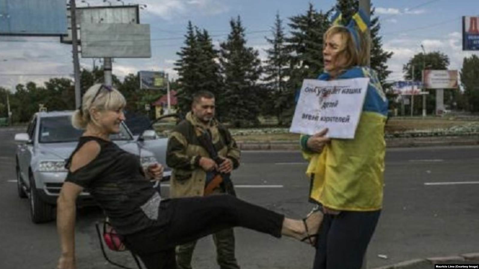 Женщину избивали, прострелили ухо и угрожали изнасилованием. Потом Ирину обмотали украинским флагом, привязали к столбу в центре Донецка и заставили держать плакат с надписью "Она убивает наших детей". Некоторые прохожие плевали ей в лицо и били ногами.