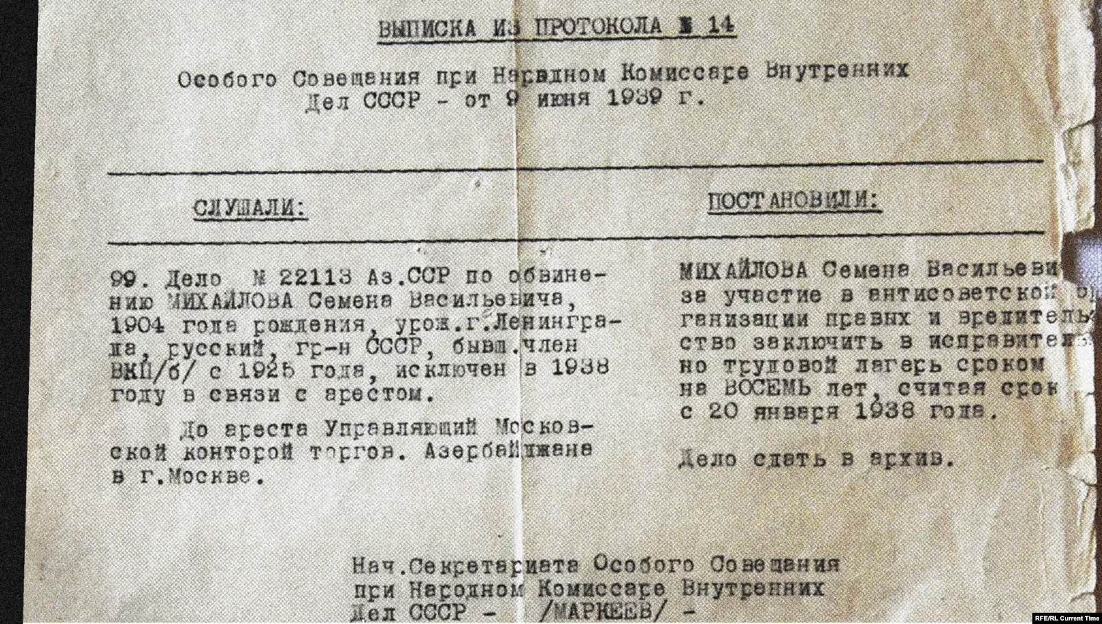 Она коротко пересказывает биографию отца, Семена Михайлова: родился в Санкт-Петербурге, учился в пединституте, был членом партии, поступил в военную академию в Москве, после был назначен начальником отдела кадров на химическом заводе. Оттуда в 1935 году поднялся по карьерной лестнице вверх – на пост представителя Москвы в Азербайджане. Дальше – 8 лет лагерей.