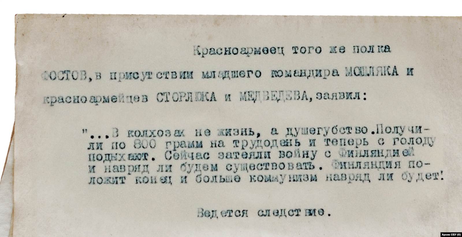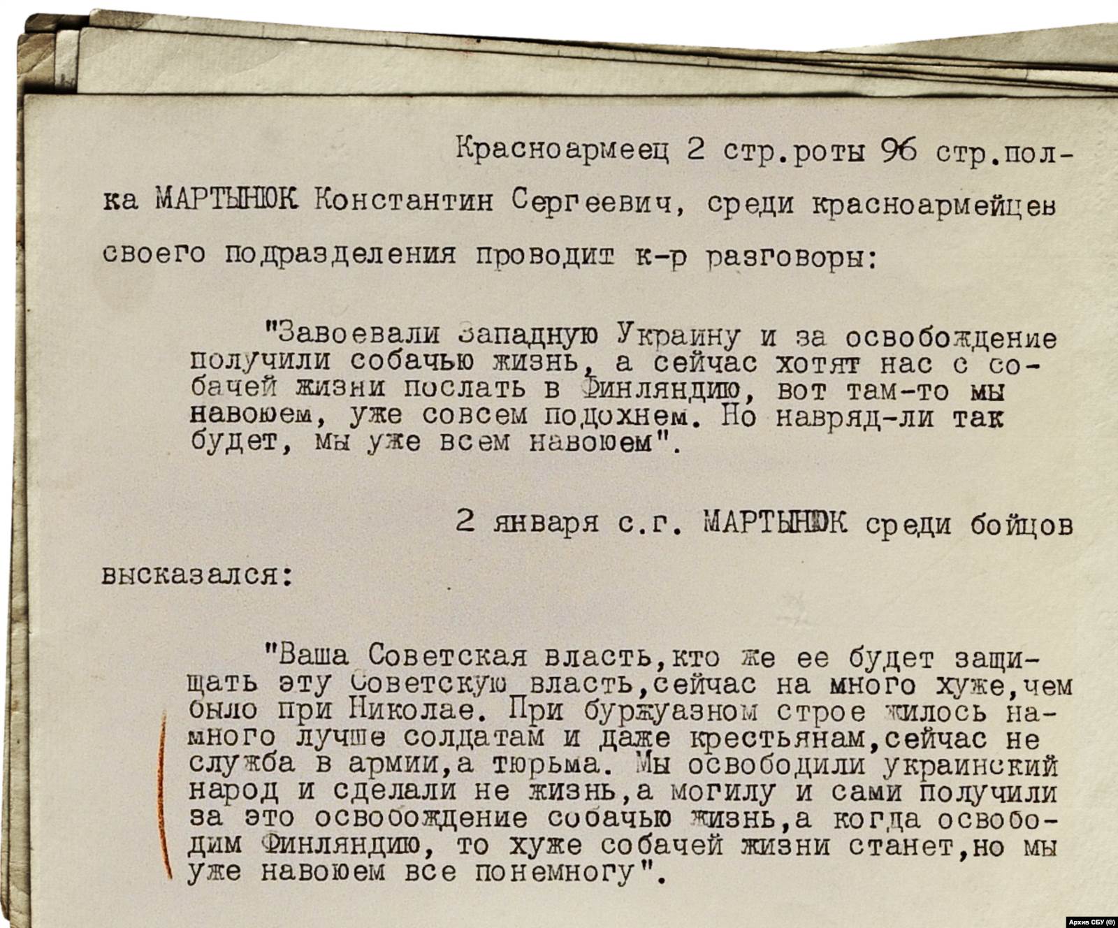 Красноармеец Константин Мартынюк позволил себе такие "контрреволюционные разговоры": "Мы освободили украинский народ (то есть население Западной Украины – НВ) … и сами получили за это освобождение собачью жизнь, а когда освободим Финляндию, то хуже собачьей жизни станет".