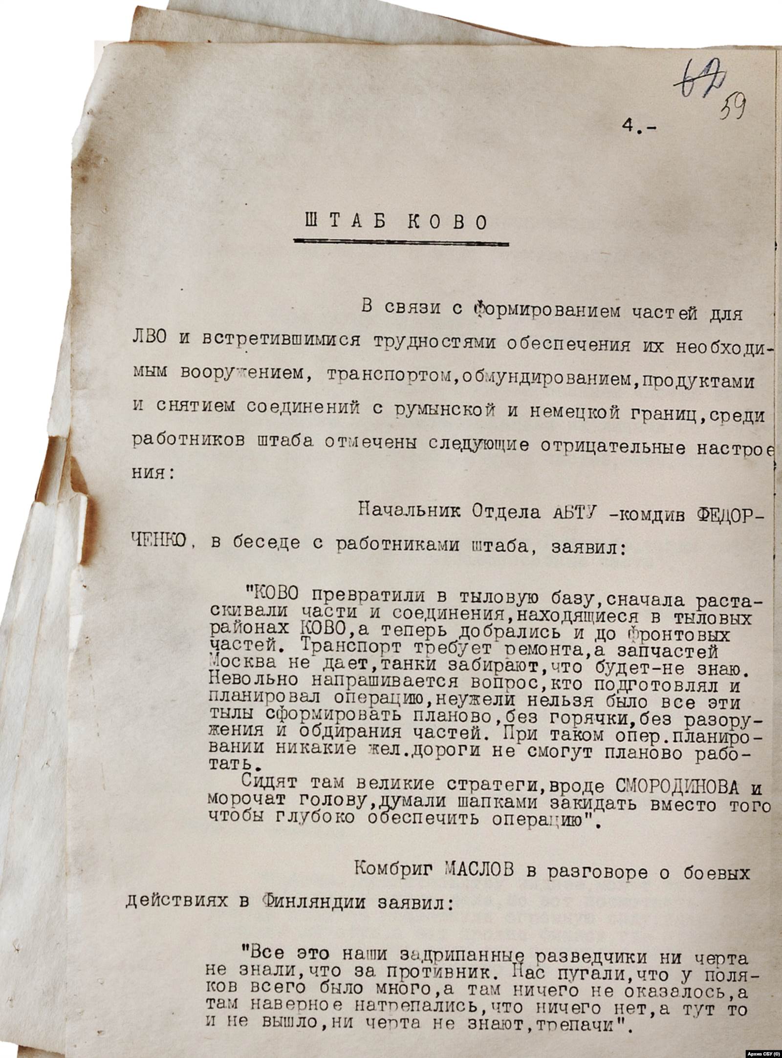 Настоящему Времени удалось отыскать документы двух округов из трех – Киевского особого и Харьковского. Как и в других военных округах по всему СССР, в них работали структуры, занимавшиеся наблюдением за настроениями военнослужащих, – так называемые особые отделы, которые собирали информацию и передавали в НКВД.
