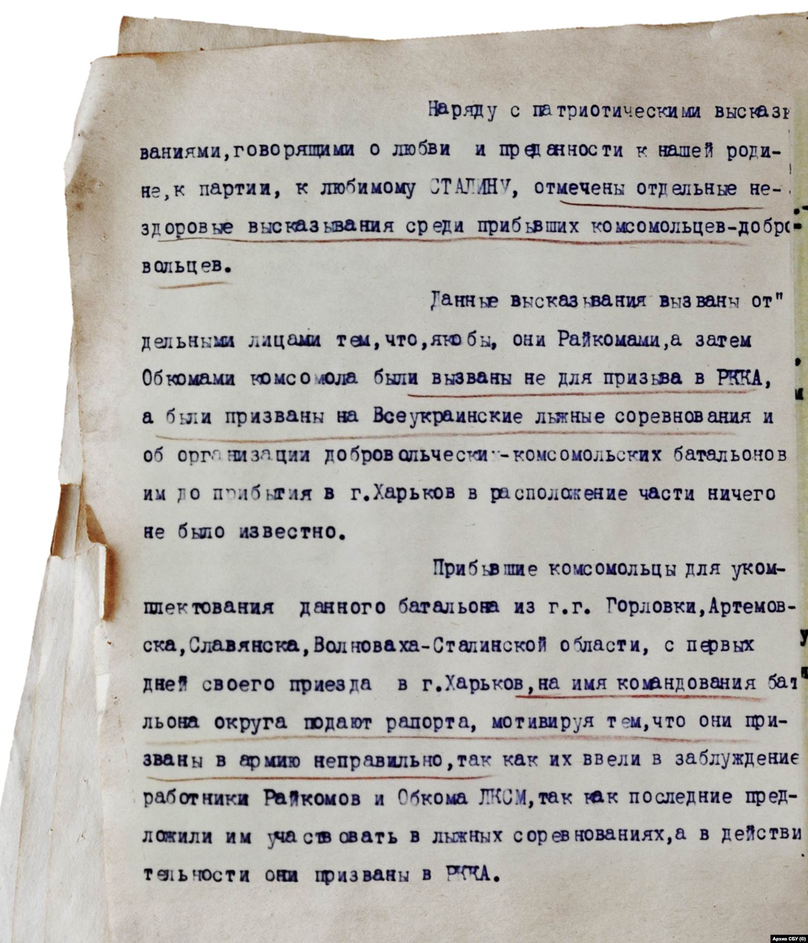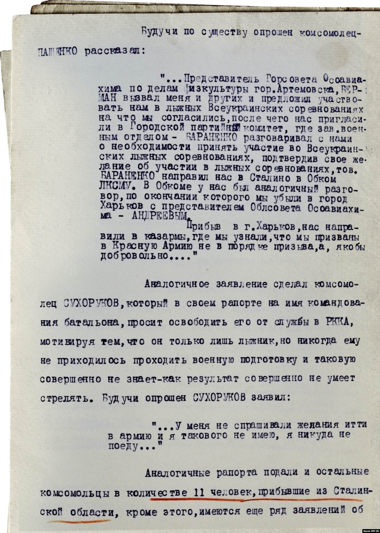 В спецсообщении НКВД говорится о комсомольцах из нескольких городов Сталинской (ныне Донецкой) области, которым в январе 1940 года работники райкомов и обкома предложили съездить в Харьков "на всеукраинские лыжные соревнования". Отправились 13 спортсменов.