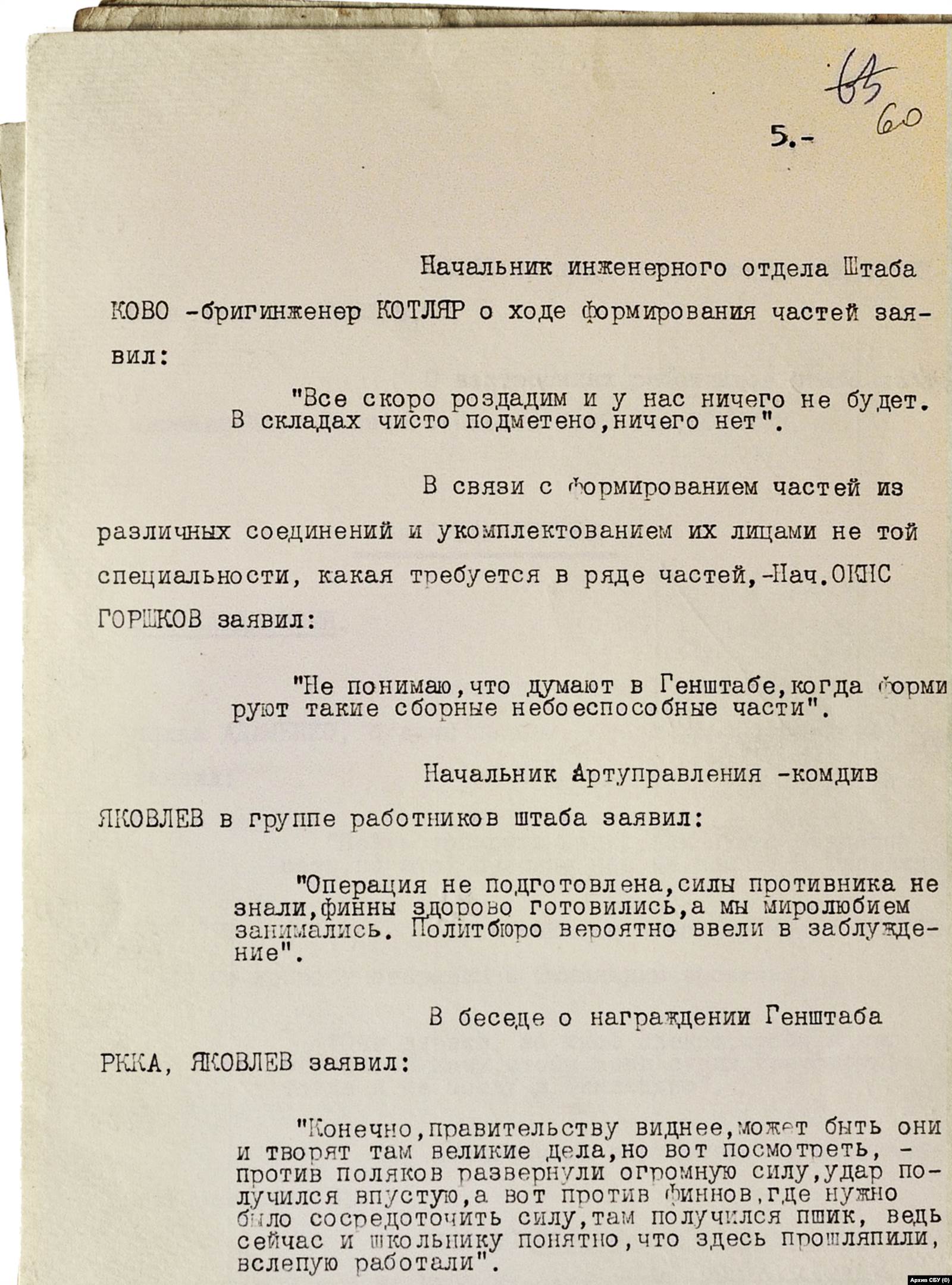 Капитан штаба 15-го стрелкового корпуса Волкодав заявил: "Мне по радио известно, что Ленинград с возложенной задачей по разгрому белофиннов не справился и что понесенные потери у нас в два раза больше, чем это опубликовано в газете".