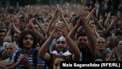 В пятницу вечером на площади собрались около трех тысяч человек. Перед собравшимися выступили представители самых разных политических партий. Их слоганом стала фраза "Все – минус один". "Один" – это правящая партия "Грузинская мечта".