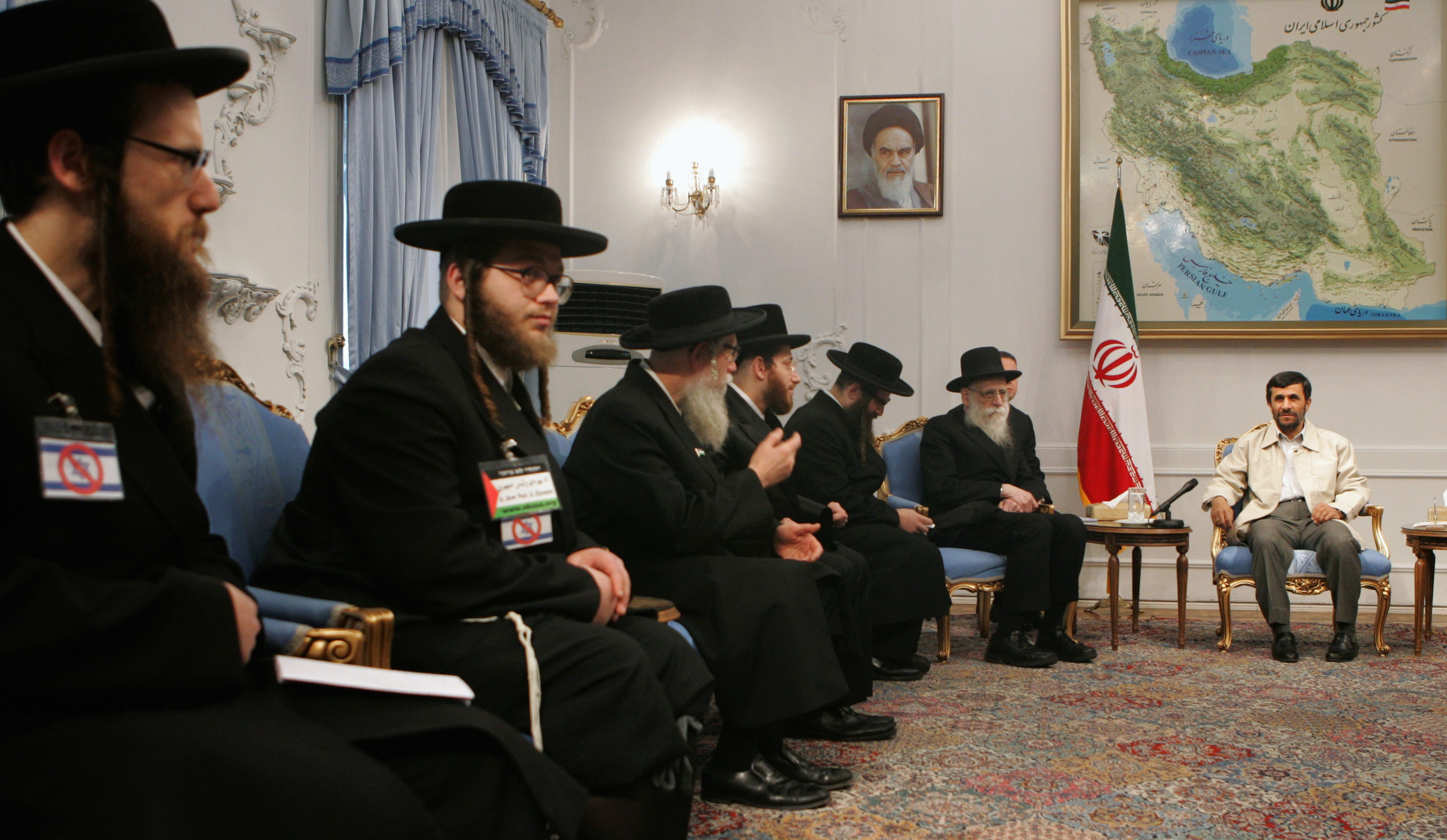 Махмуд Ахмадинежад во время конференции отрицателей Холокоста. Напротив него сидят члены организации "Нетурей карта" – иудейского религиозного движения, которое выступает против сионизма и существования Израиля. Тегеран, 14 декабря 2006 года