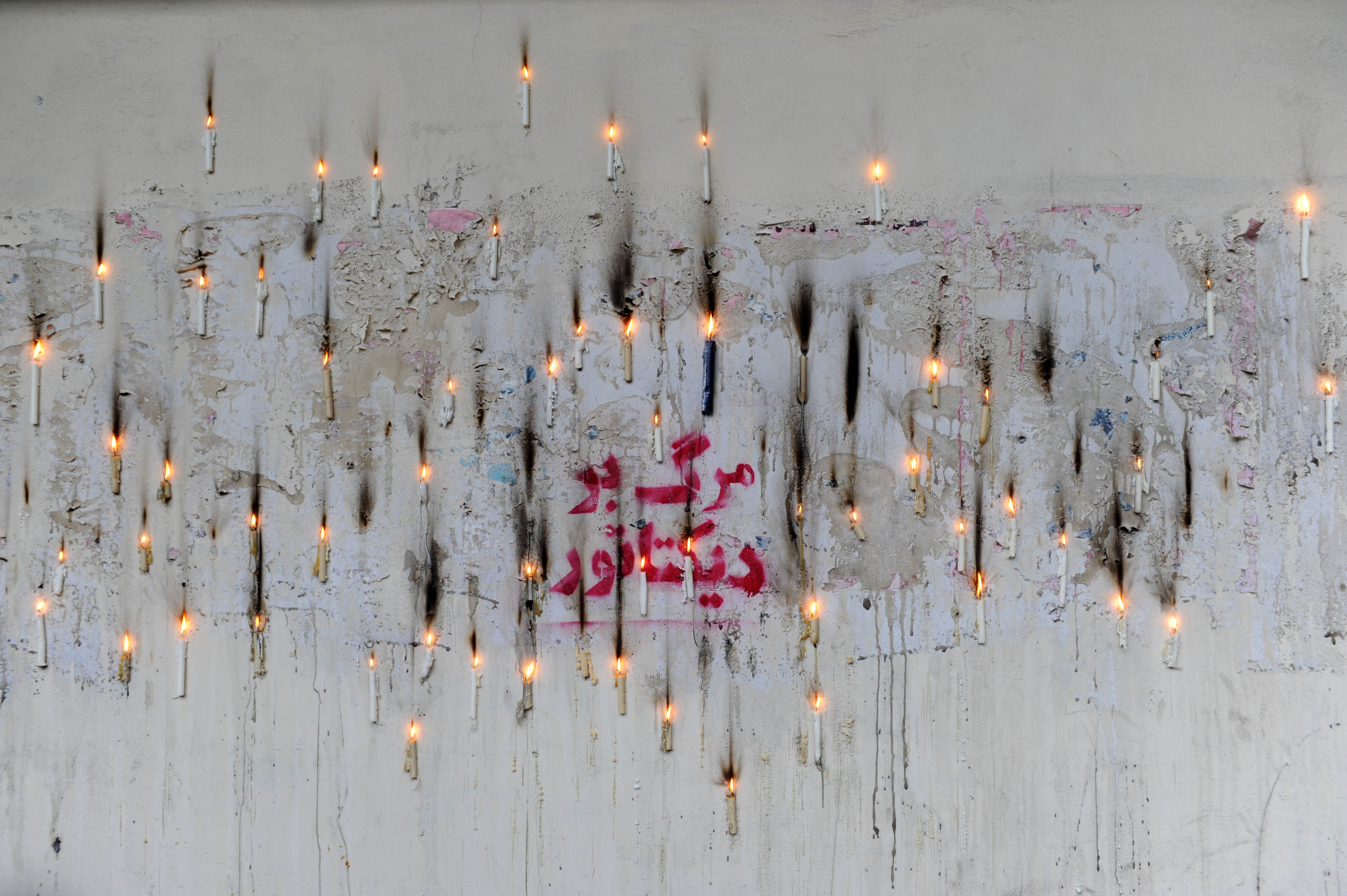 Импровизированный мемориал погибшим во время расстрела демонстрантов. На стене написано "Смерть диктатору". 16 июня 2009
