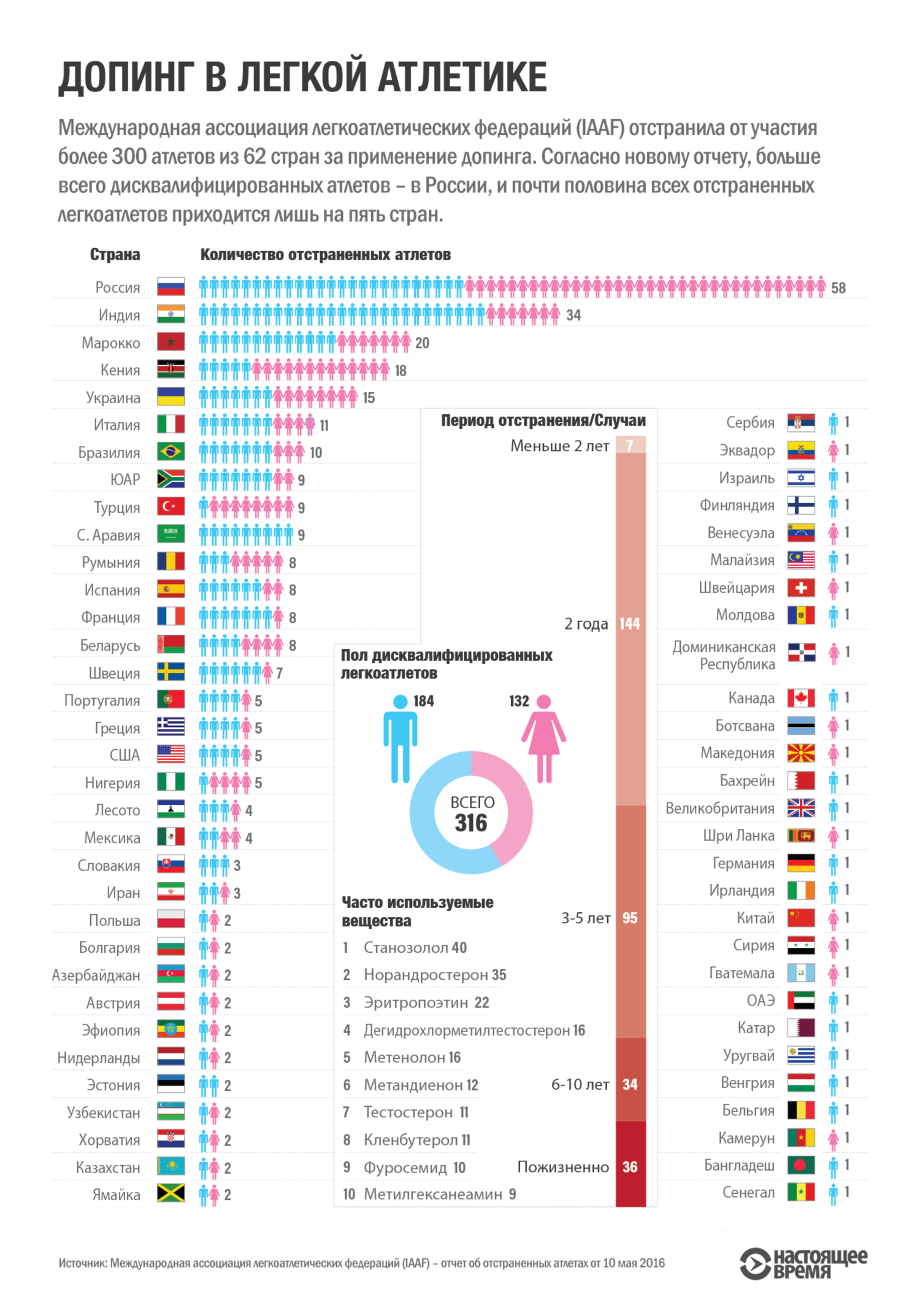 Международная ассоциация легкоатлетических федераций (IAAF) отстранила от участия более 300 атлетов из 62 стран за применение допинга. Согласно новому отчету, почти половина всех отстраненных легкоатлетов приходится лишь на пять стран.