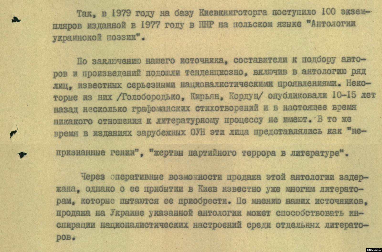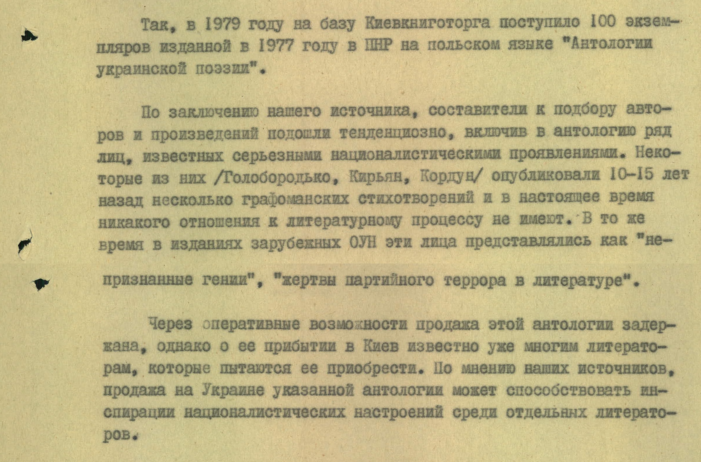 Например, немало вопросов у чекистов было к польскоязычной «Антологии украинской поэзии», изданной в ПНР в 1977 году. Составителей обвинили в тенденциозности при подборе материала: в сборнике нашли произведения «лиц, известных серьезными националистическими проявлениями».