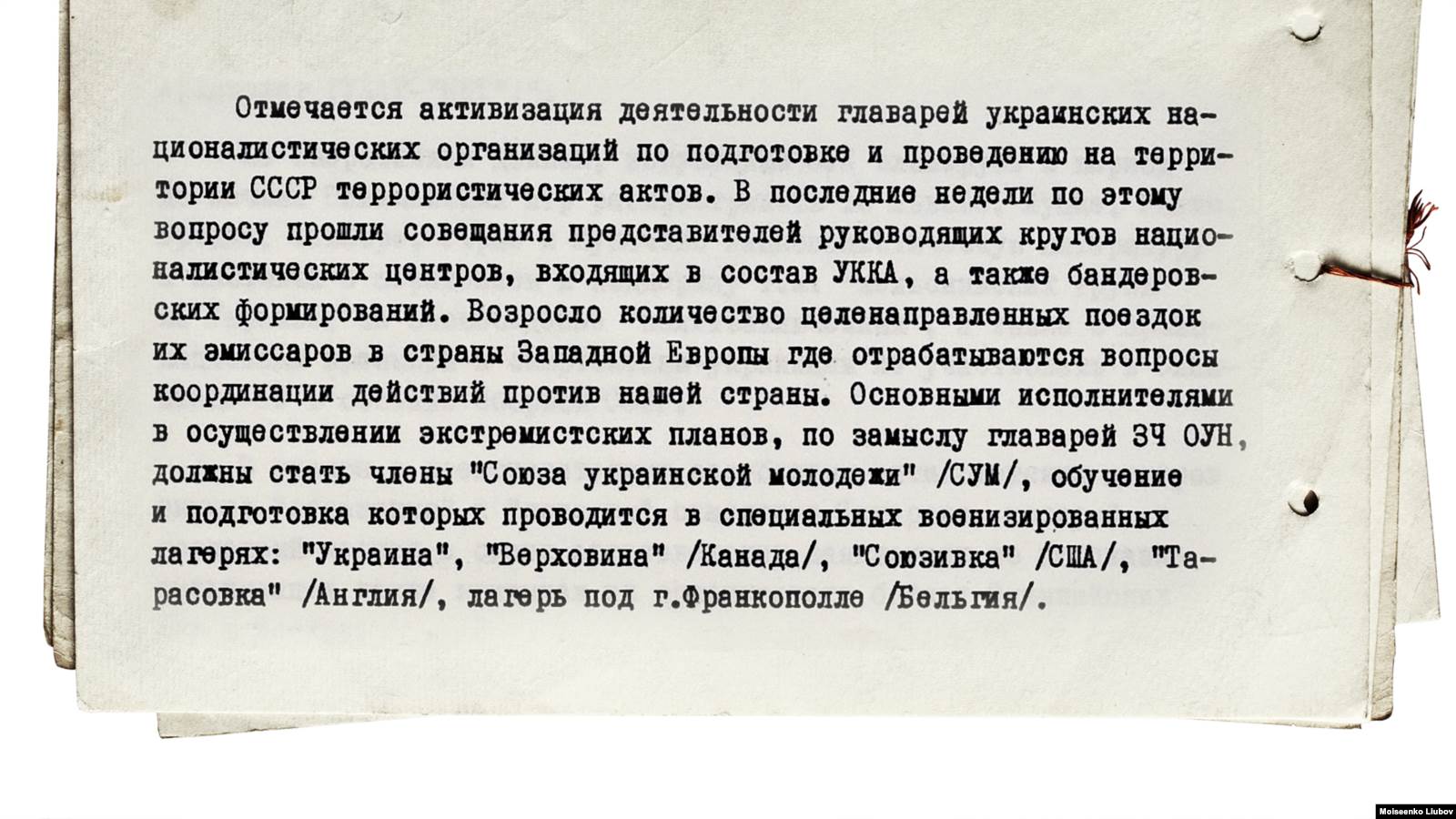 "Террористические акты" якобы готовили и украинские националисты. В документах уточняется, что исполнителями должны были стать члены "Союза украинской молодежи" (СУМ) – близкой к "бандеровской" фракции ОУН молодежной спортивно-патриотической структуры. Участников будущих терактов якобы специально готовили в тренировочных лагерях Америки и Европы.