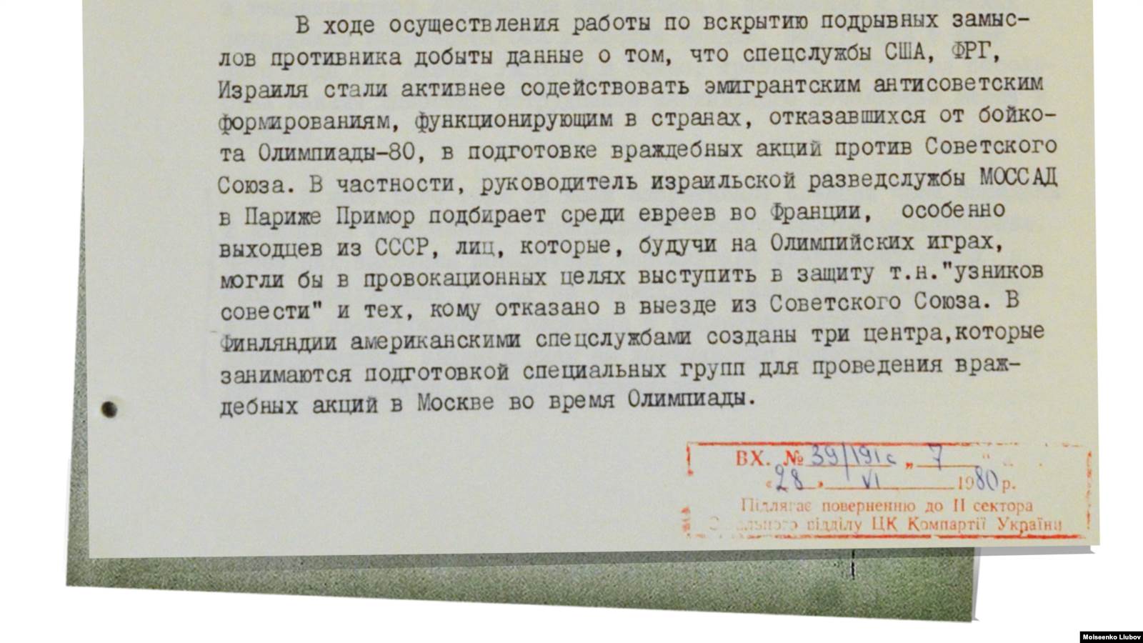 "В частности, руководитель израильской разведслужбы Моссад в Париже Примор подбирает среди евреев во Франции, особенно выходцев из СССР, лиц, которые, будучи на Олимпийских играх, могли бы в провокационных целях выступить в защиту т.н. "узников совести" и тех, кому отказано в выезде из Советского Союза", – писал в одном из донесений Виталий Федорчук.
