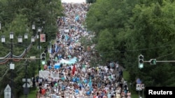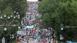 В Хабаровске 25 июля прошла очередная, пятнадцатая по счету акция в поддержку арестованного губернатора Хабаровского края Сергея Фургала. По оценкам организаторов, в ней приняли участие несколько десятков тысяч человек, ее называют крупнейшей акцией протеста в истории города.