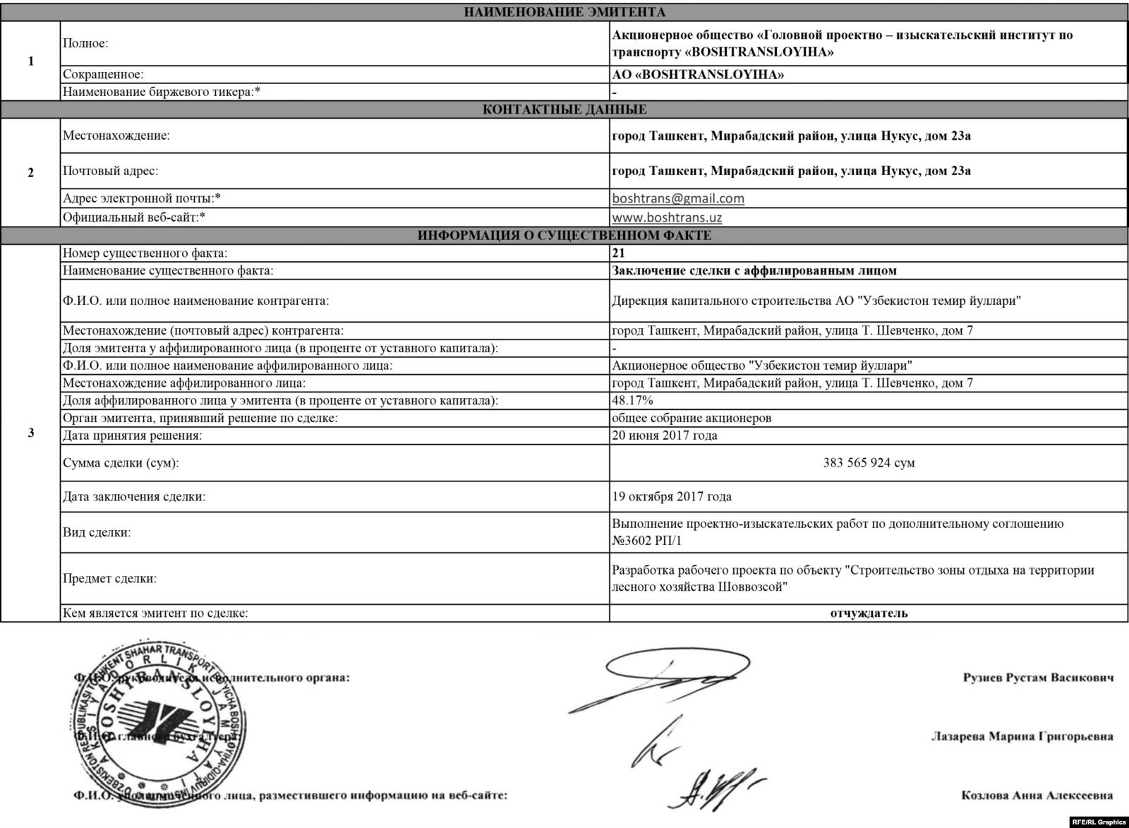 Это соглашение, подписанное с дирекцией по капитальному строительству "Узбекистон темир йуллари", называется "Разработка рабочего проекта по объекту "Строительство зоны отдыха на территории лесного хозяйства Шоввозсой".