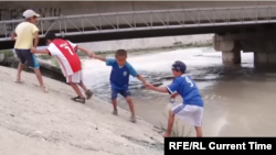 За водой на речку мальчишки из села Жибек-Жолу ходят 2 раза в день. Даже в том месте, где вода течет медленнее всего, набирать ее опасно.