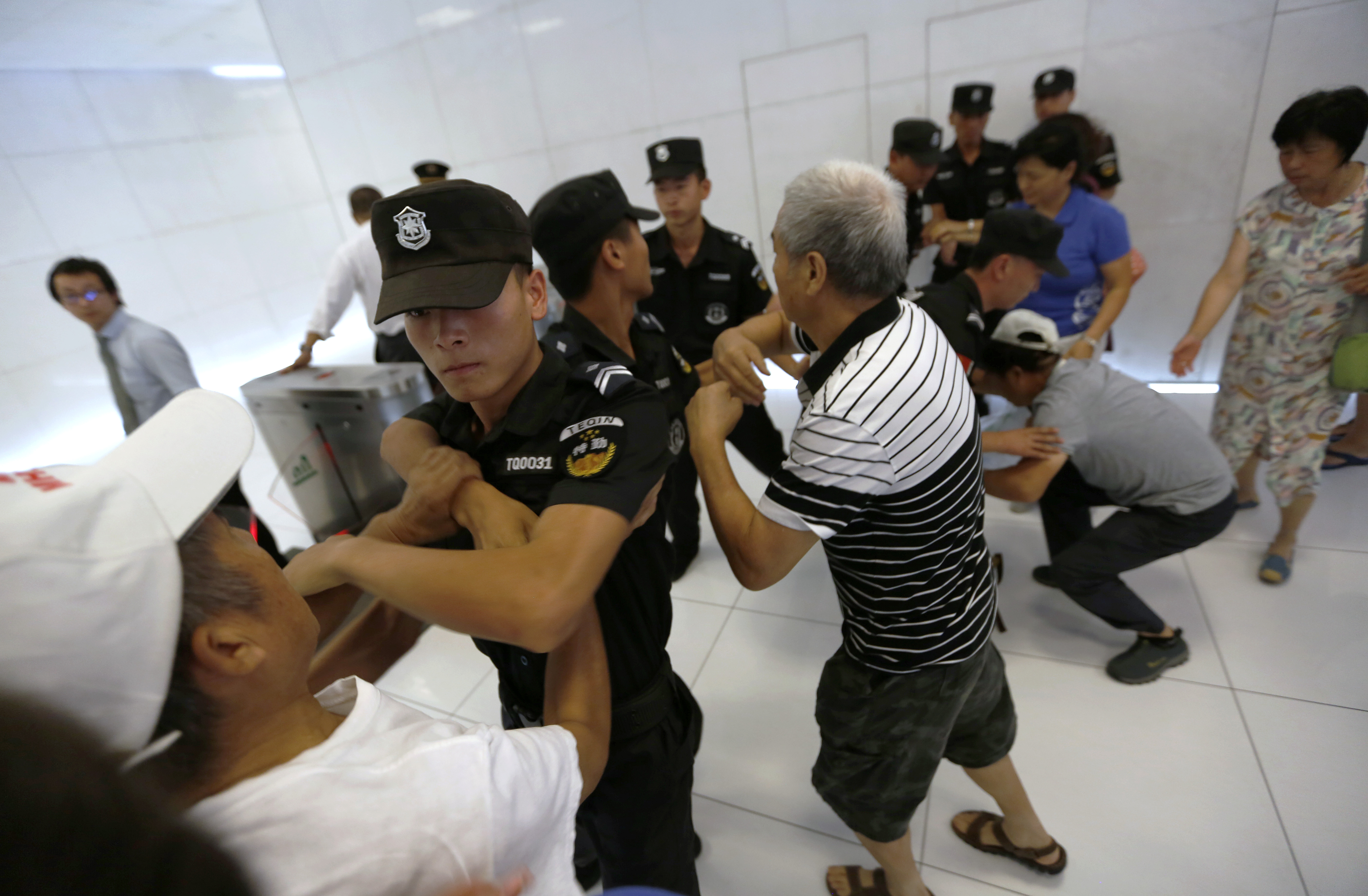 Родственники китайских пассажиров MH370 пытаются прорваться в офис Malaysia Airlines в Пекине, 5 августа 2015 года. Фото: EPA